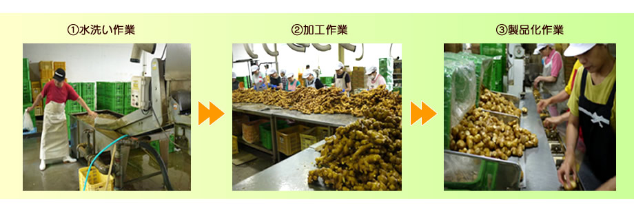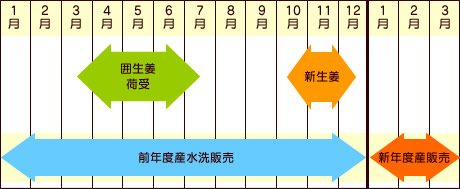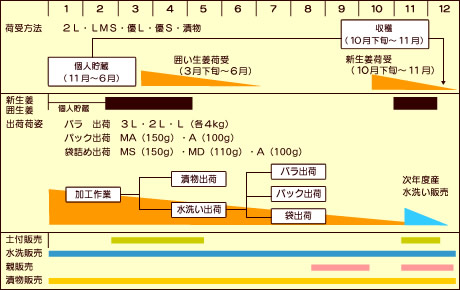 貯蔵施設による生姜の周年販売特性を活かしながら、予約相対取引を実施し、取引市場及び取引量販店の年間値決めのなかでおこない、生産者手取り価格の維持に努めています。
